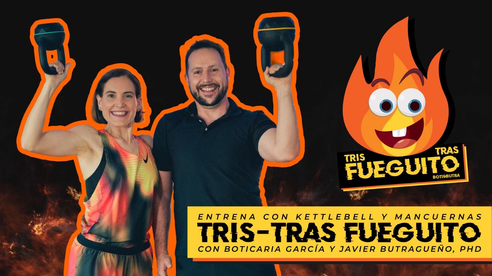 TRIS TRAS FUEGUITO combina el trabajo de fuerza, potencia y resistencia con ejercicios de mancuernas y kettlebells, diseñados para entrenar desde casa, en poco tiempo y con una sensación real de progreso.
